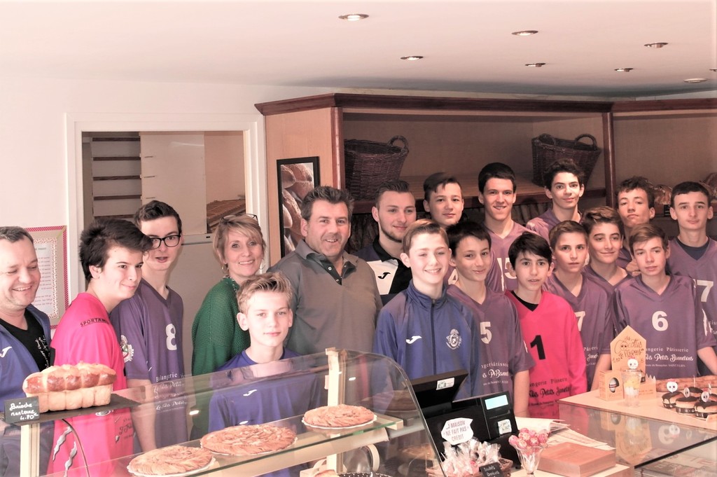 Cédric et Astrid, artisans boulanger-pâtissier à Saint Julien, ont vu leur boutique se remplir du groupe de nos jeunes 15 Garçons, désireux de les remercier pour l’acquisition d’un nouveau jeu de maillot très design.
